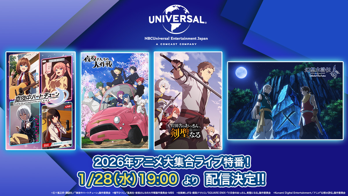 NBCユニバーサル・エンターテイメントジャパンは、1月28日(水)に2026年アニメ新作ラインナップを発表いたします。同日、発表を記念したライブ特番の配信が決定!